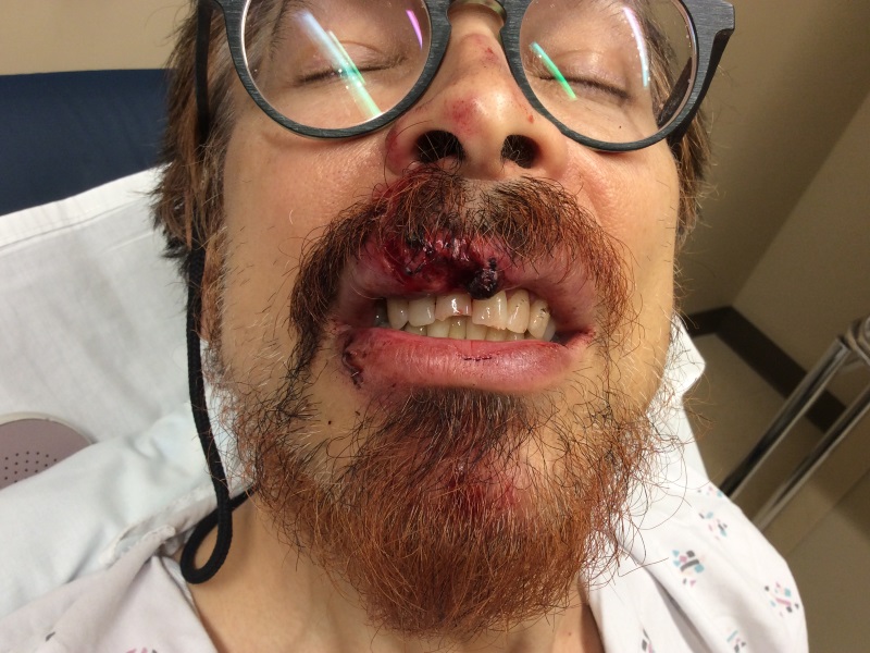 July 19. Yesterday I wiped out on my scooter. I took a turn too fast, leaned over too far, and the scooter caught on the road and fell over at 20-25mph. I was wearing a helmet, but it was not a full face helmet and my visor was up, so did a hard faceplant into the pavement. Here's a gruesome photo of my mangled upper lip and cracked teeth. My body is really good at self-numbing, so it was barely painful, and otherwise I felt okay, so I almost sent the paramedics away and went home. Then they asked me what month and year it was, and I didn't know if it was June or July or 2015 or 2016, so I got in the ambulance.