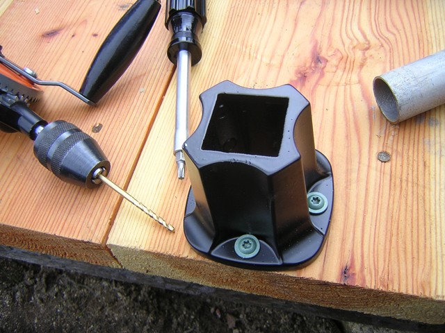 How to attach a wall tent to a platform -- 15 April 2010 -- Last summer I made a tent platform, and that link goes to the post about it. I decided to make the platform exactly fit the inside of the tent, so that the legs could sit up on it and the walls could drop down over the edges. But this spring, before I could put the tent on the platform and sleep in it, I had to figure out how to get it to stay on. It's not just that the wind might blow it off, but that the bottoms of the six legs need to be held in with some tension to make the walls fit and allow the zipper to close. My first idea was to carve holes in the platform, an inch diameter and a half inch deep. But I was afraid that wouldn't be deep enough, and any deeper could break the wood, which is only an inch and a half thick. My next idea was to cut a board into squares, drill one inch holes all the way through, and screw them to the platform. Then Charlie had an idea that was easier and more sturdy, but also more expensive. He suggested using a "flange".