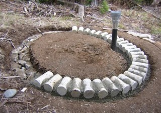 Foundation -- 25 April 2010 -- My policy is to not write about any project until after I've done it, but it's becoming obvious that the mysterious stone circle I made last fall (in this post) is the foundation for a structure. A week ago, I picked up eight 80 pound bags of concrete mix from Home Depot, and Ian and Jana came up to help me. Mixing concrete with a shovel is surprisingly easy if you do it a bag at a time -- and if you can lift 80 pounds. If not, the 60 pound bags are only a slightly worse value. I was afraid it would be so wet that I would have to fill the whole trench, which would have required a lot more of it. But we could keep it firm enough to just fill the cracks between the urbanite and get a couple inches on top.